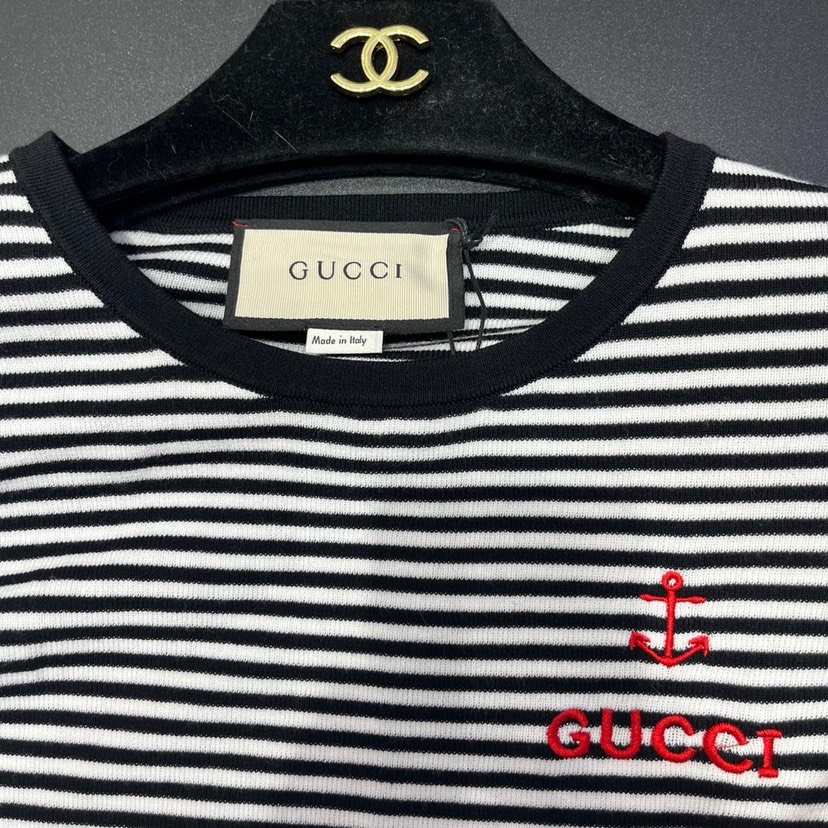 Home / New Gucci 23 Spring/Summer New Contrast Stripe Hollow Waist Letter Knit Dress
