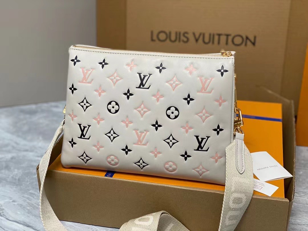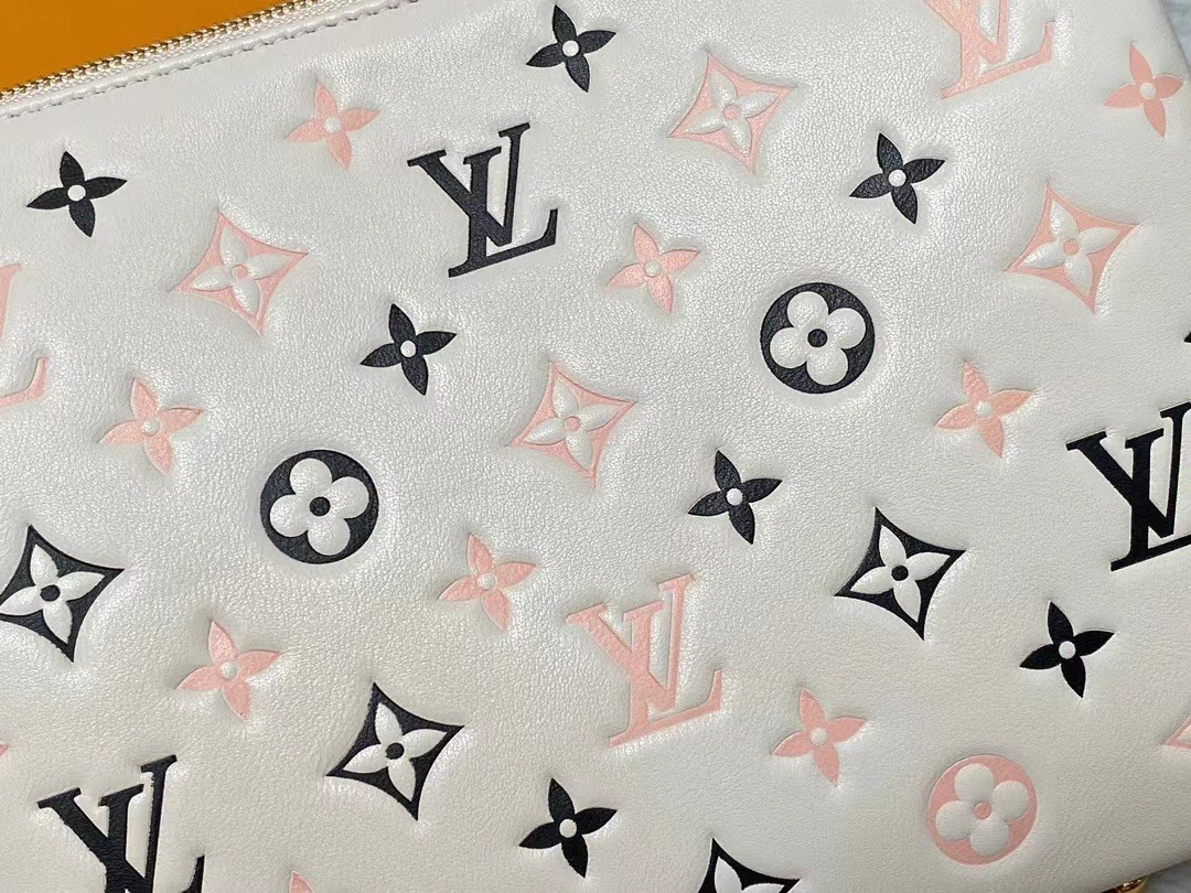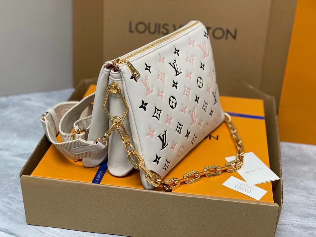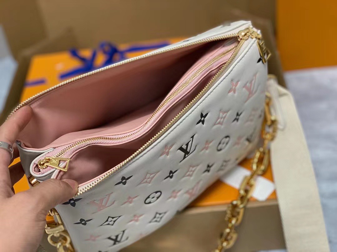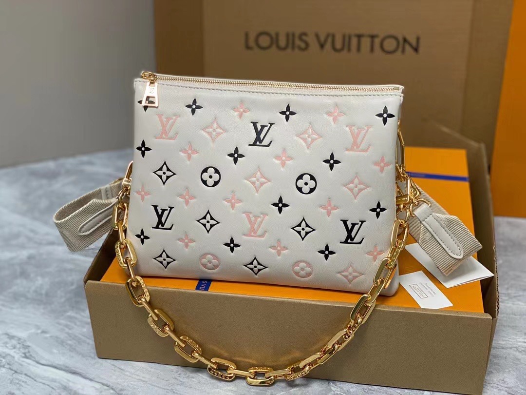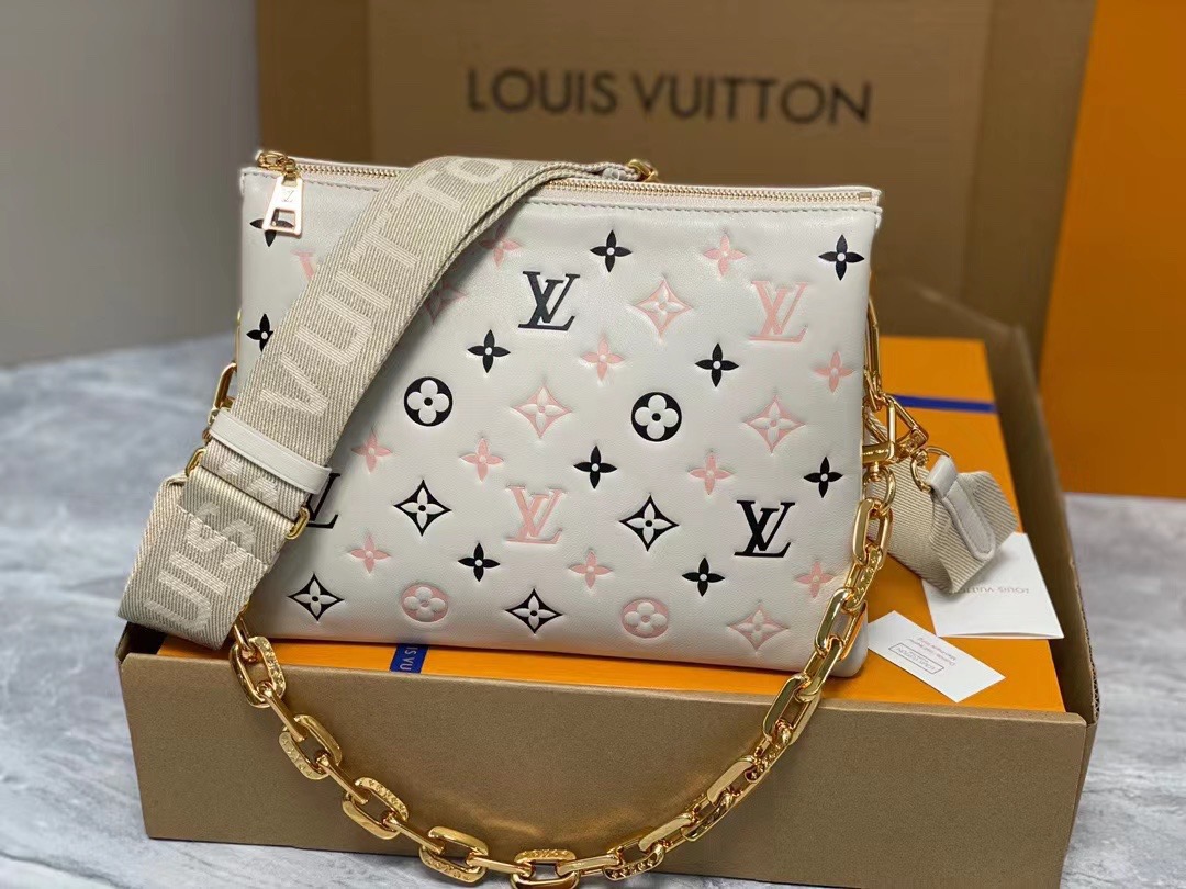 The new season's new cousin small handbag m57791 cousin small tricolor handbag from the p950 m22954 white full leather chain bag series has emerged in soft colors this summer. Sheepskin leather is embossed with a Monogram pattern, woven into the chain by the pool of silk scarves, bringing a trendy atmosphere to your face. Removable and adjustable leather shoulder straps add styling options. Detailed features 26 x 20 x 12 cm.
