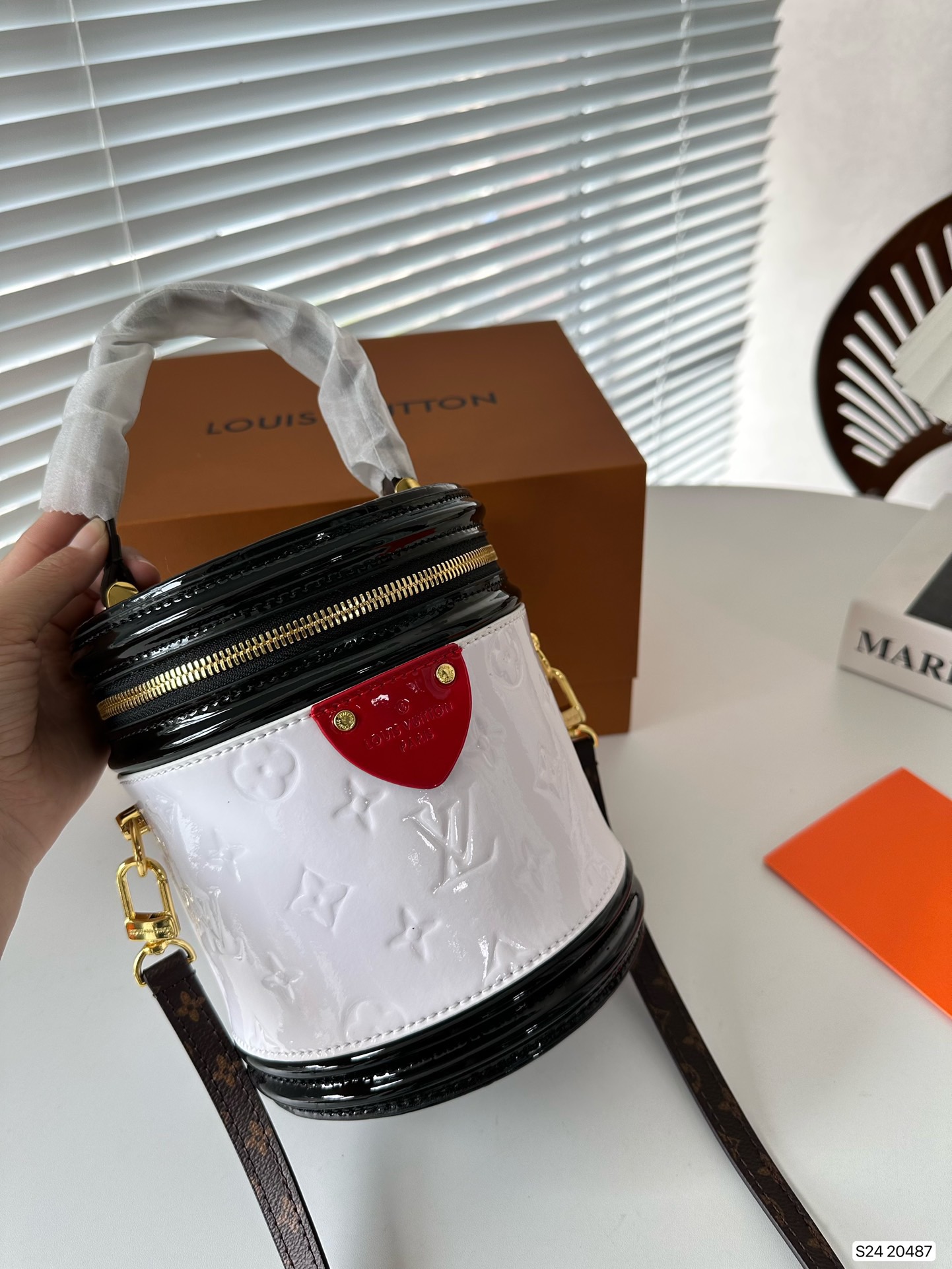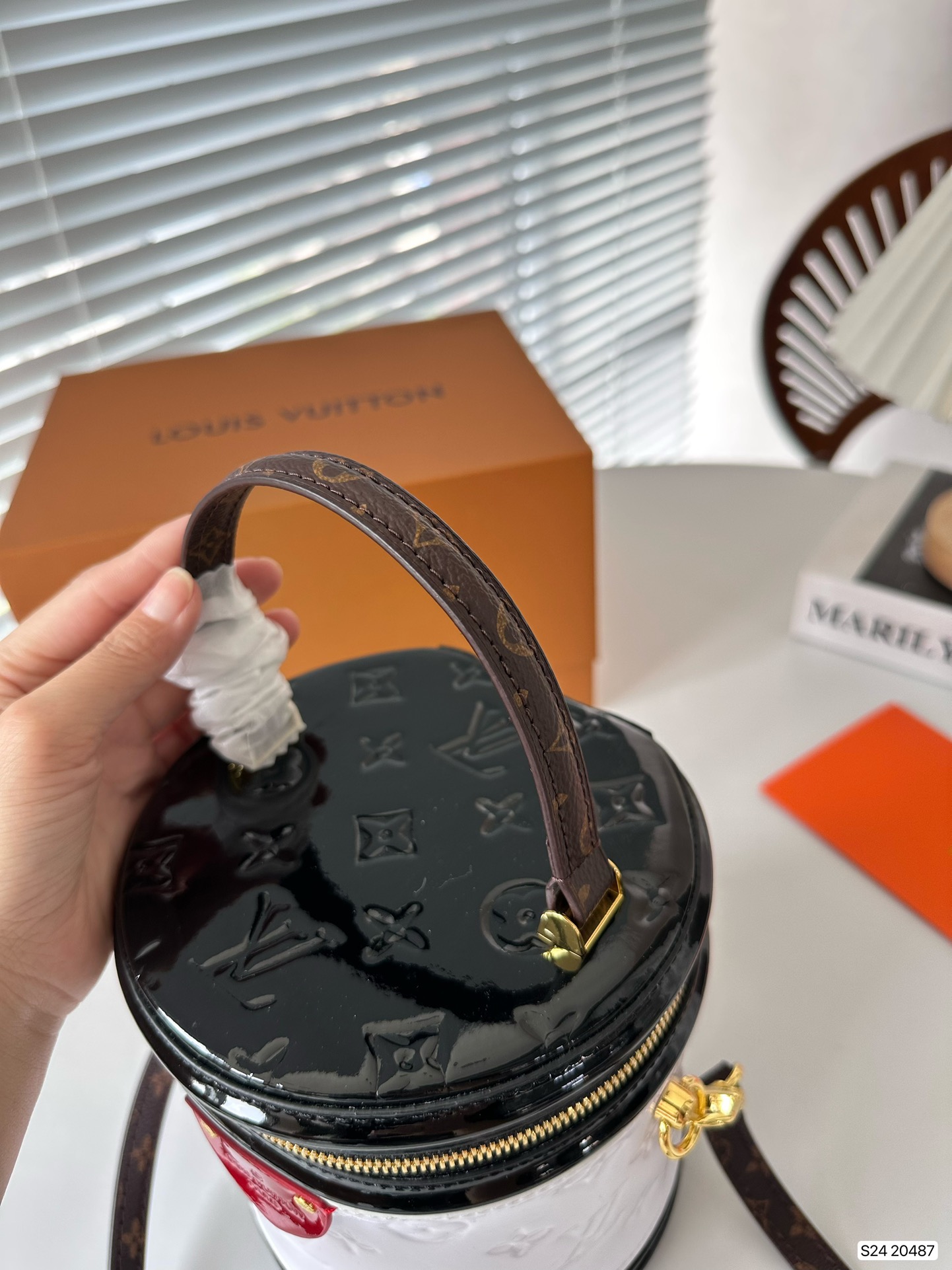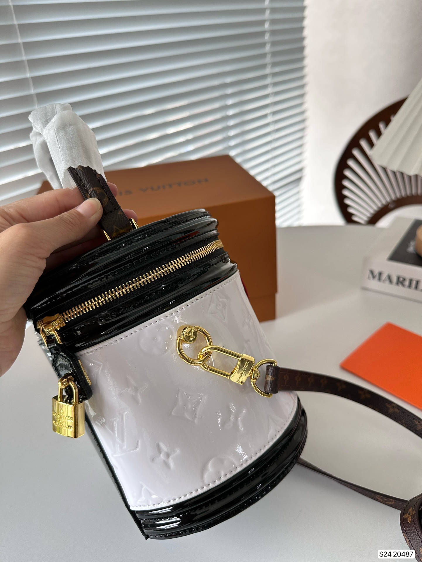 P270 folding box LV patent leather wealth container, with a unique barrel shaped design that hits the heart of a girl, the most important star, not too easy to wear clothes, can be perfectly matched! Size: 15 17 Art. No. 20487
